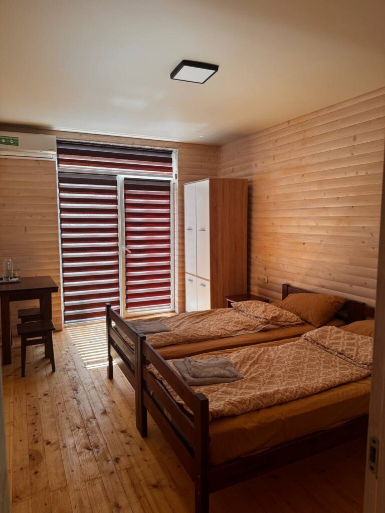 Дерев’яні номери з балконом, видом на ліс, кондиціонером, телевізором, столиком і шафою. У вартість входить користування басейнами, волейбольним майданчиком та зонами відпочинку: 5 великих, 2 середні та 1 велика альтанка на 50 осіб з мангалом, умивальником і зоною для приготування страв.₴ 1,800 1800